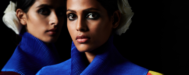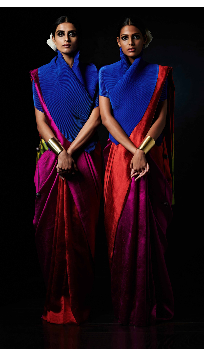 "Accessorized with our handmade pleated flowers, recycled from studio waste, to dress the hair and minimal Tachi arm cuffs in stainless steel and brass - this collection doubles the fun of styling the sari in a restrained yet luxurious, but dramatic way. The spirit as always is fierce and feminine and still intrinsically India modern."