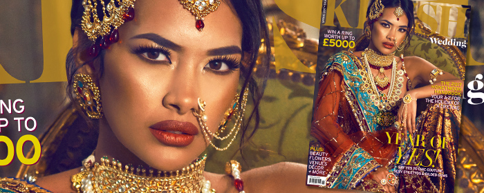 THE MAKEUPFor the Pakistani-led cover look, we called in beauty supremeo Symah Khan. Creative and innovative, we knew she alone could create a look that’s authentic yet editorial. Taking inspiration from the rich colours of the outfit, she began by enhancing our model’s features with bronzer and contour before sealing lips with a warm rust hue. Eyes were left simple, with deep nudes, metallics and the faintest smudge of kohl.SYMAH KHAN• www.SymahKhan.comTHE OUTFITWalking into O’nitaa’s flagship store in Marylebone is like stumbling across a portal to an Aladdin’s Cave filled with Asian designers. The stunning concept boutique is filled with a range of elite brands, exquisite couture and some of the very best Indian and Pakistani bridalwear to be found in the capital. For our Pakistani-inspired cover, the Khush Creative team decided on a traditional bridal look; a Sharara, a pair of voluminous pleated trousers worn with a decorated kameez and dupatta. Created by acclaimed Pakistani designer Rana Noman, our cover outfit is a fresh, modern take on a timeless classic. We adore the sheen on the bronze trousers, highlighted by the azure blue of the dupatta border.O'NITAA• www.Onitaa.co.ukTHE JEWELSOur cover jewellery was about complementing the majesty of the outfit. Jeweller Anees Malik creates alluring ornaments, so who else would we call for the finishing touches? Layering is a styling trend that shows no sign of slowing, which is why we’ve opted for a muti-layered bridal jewellery look. A nose stud with chain completes the look. ANEES MALIK• www.AneesMalik.co.uk