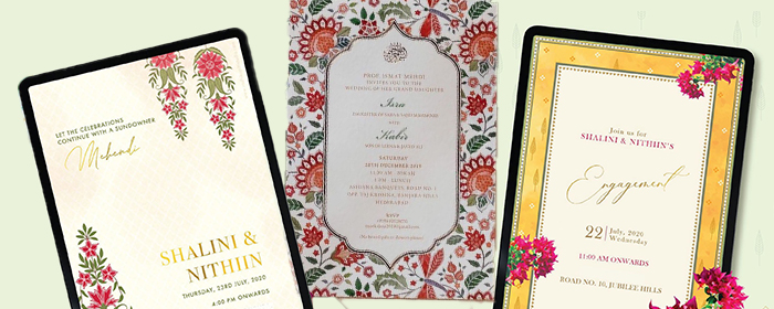 Traditional Wedding Invites We LoveSome of Radhika Pitti Studio’s best traditional invites include former Khush cover star RajKummar Rao and Patralekhaa’s stunning video invite that comprised peacocks and architectural inspiration. It was the perfect teaser to give a peek into the Bollywood couple’s wedding venue, The Oberoi Sukhvilas Spa Resort, New Chandigarh. She’s even made all-floral versions but created some flowers in a hand-painted effect and a different variety in the same card in gold foil technique. In another blooming instance, she gave chintz printed invite an Indian appeal.For one of her clients, Radhika created a play of Kamdhenu cow (a form of Hindu Devi) alongside painted pink lotuses. We also love her Tanjore painting style invite that features depictions of lord Ganesha and Balaji. If you are looking for some inspiration, the below wedding invitation ideas are on you need to bookmark.